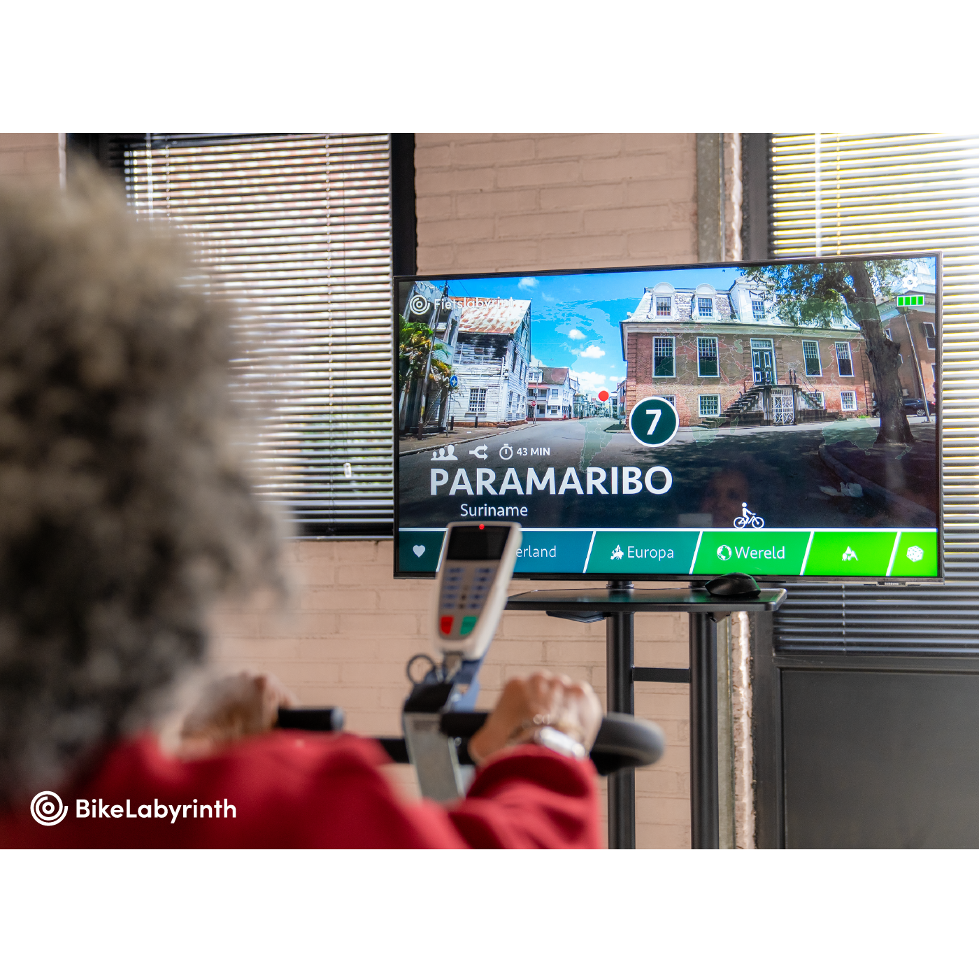 Bike Labyrinth is displayed through a screen in front of a home trainer or exercise trainer and is widely used in Europe at rehabilitation and elderly care facilities.